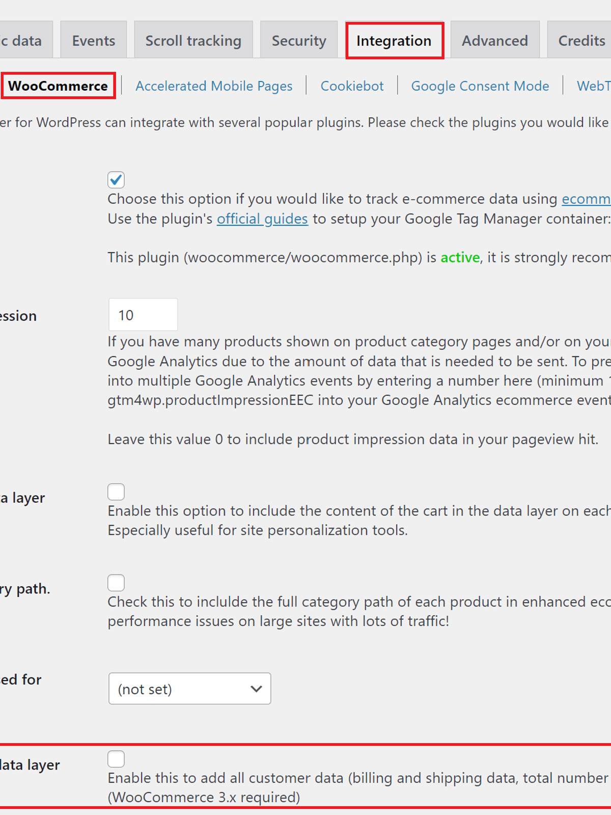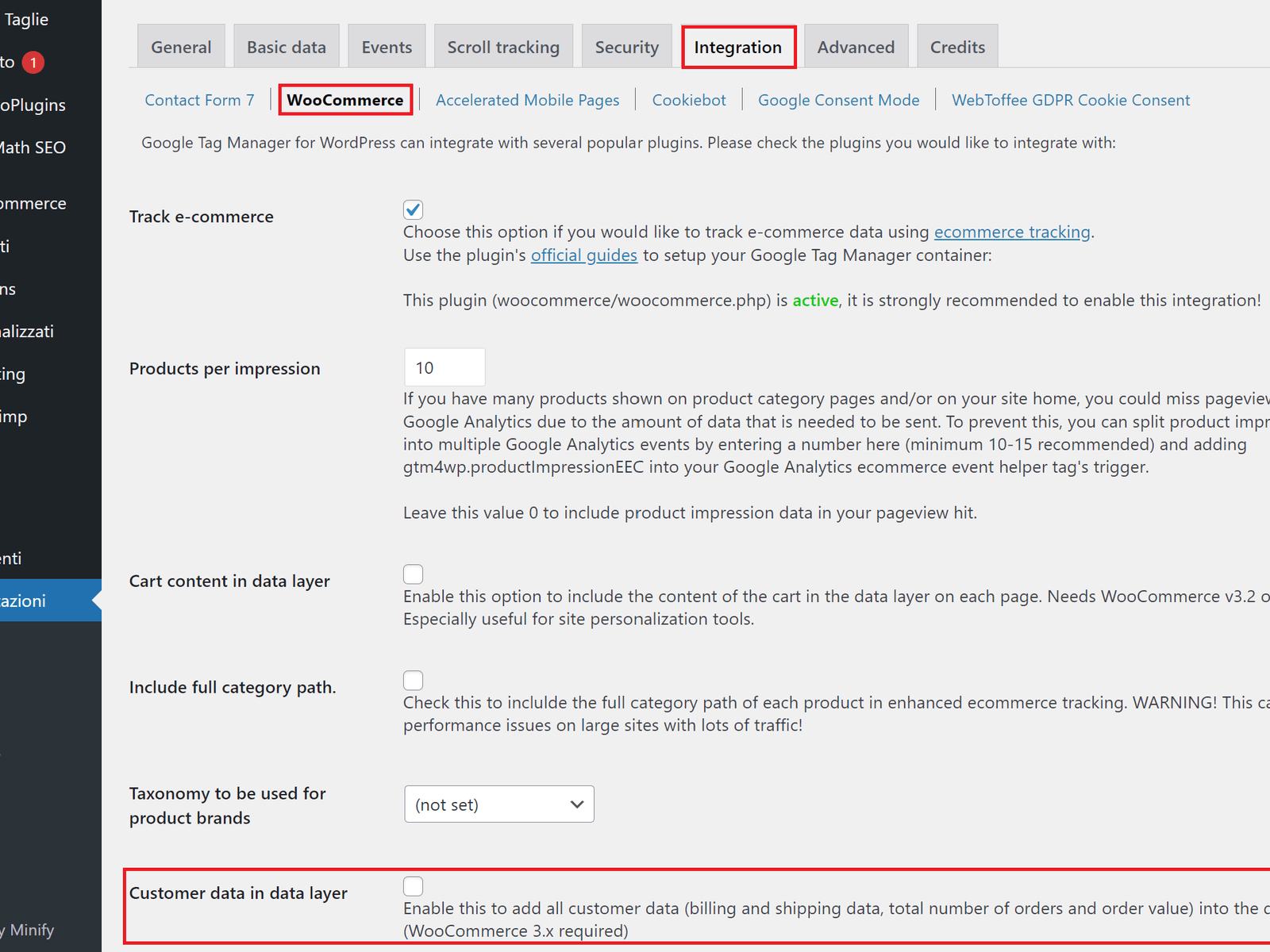 Come puoi notare, mancano i dati forniti dall’utente. Tuttavia, con WooCommerce, il plugin semplifica notevolmente l’implementazione. Basta andare nelle impostazioni di GTM → Integration → flaggare Customer data in data layer.