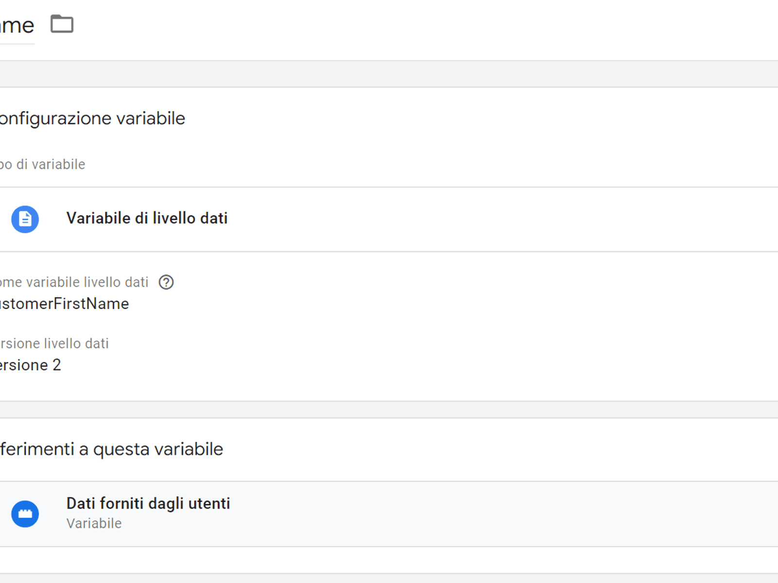 Una volta create le variabili, crea una variabile di tipo Dati forniti dagli utenti. Tipologia di configurazione: manuale. A questo punto non resta che selezionare la variabile che hai creato per ogni dato tracciabile.