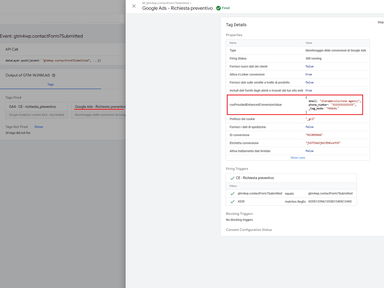Una particolare attenzione la richiede il numero di telefono, che deve essere nel formato E.164: composto da 11 a 15 cifre, con il segno più (+) e il codice del Paese, senza trattini, parentesi o spazi. La diagnostica degli obiettivi su Google Ads non segnala il formato errato del telefono, per cui è fondamentale implementarlo correttamente. Nel caso in cui il form non preveda queste verifiche e il sito sia dedicato solo ai clienti sul mercato italiano, la verifica e l’aggiunta del codice del Paese potrebbe essere eseguita tramite una variabile Javascript personalizzata. Un esempio può essere questo: