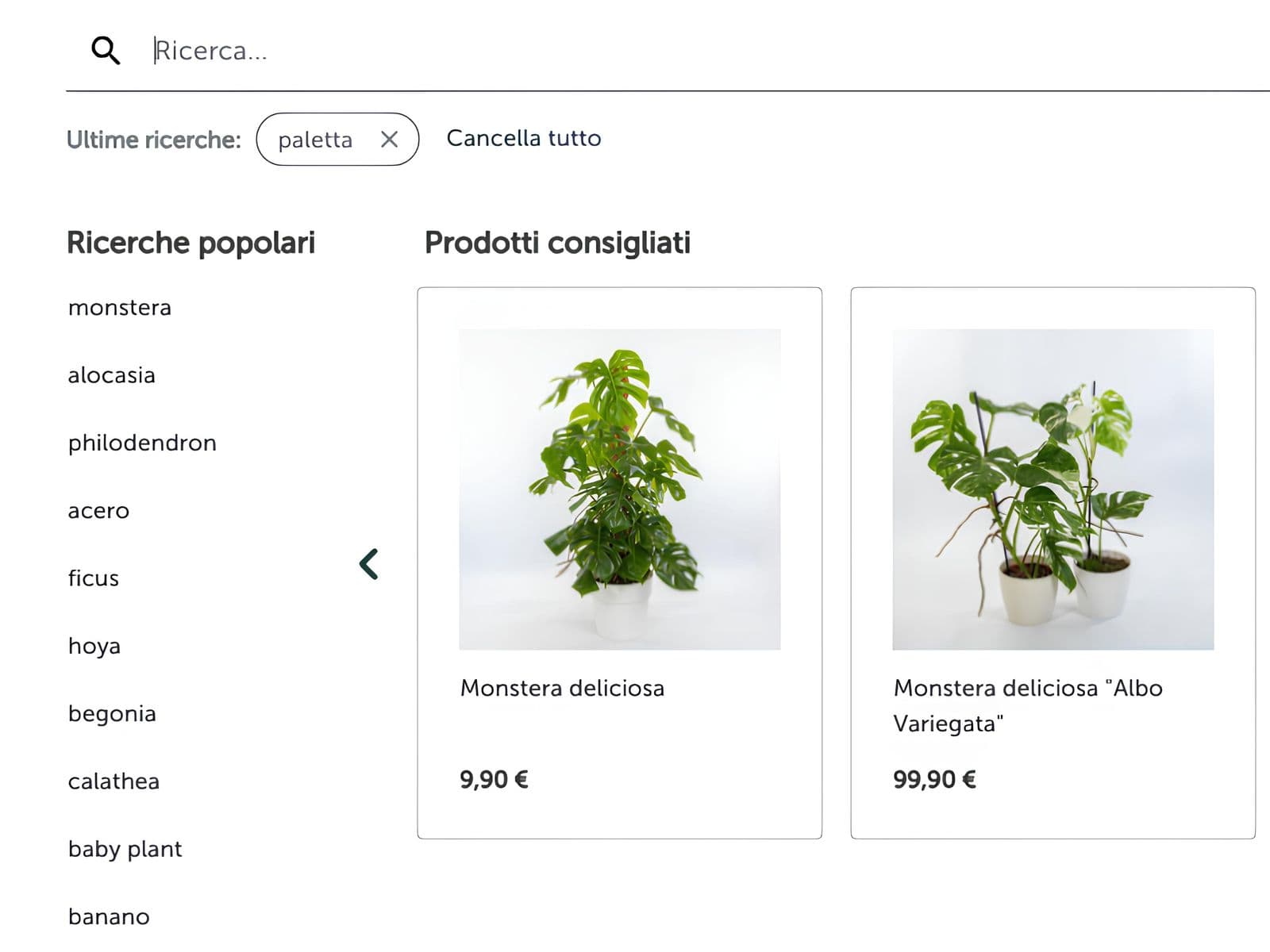 Già dall’analisi delle richieste dei clienti e dei semplici utenti dell’eCommerce era chiaro che un punto focale del redesign doveva essere la ricerca. Abbiamo dunque scelto di inserire tool per la ricerca avanzata e funzioni come “inviaci la fotografia della pianta che cerchi” rendendo lo step di ricerca decisamente più veloce.