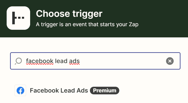 1. Creare un nuovo Zap e scegliere come trigger Facebook Lead Ads