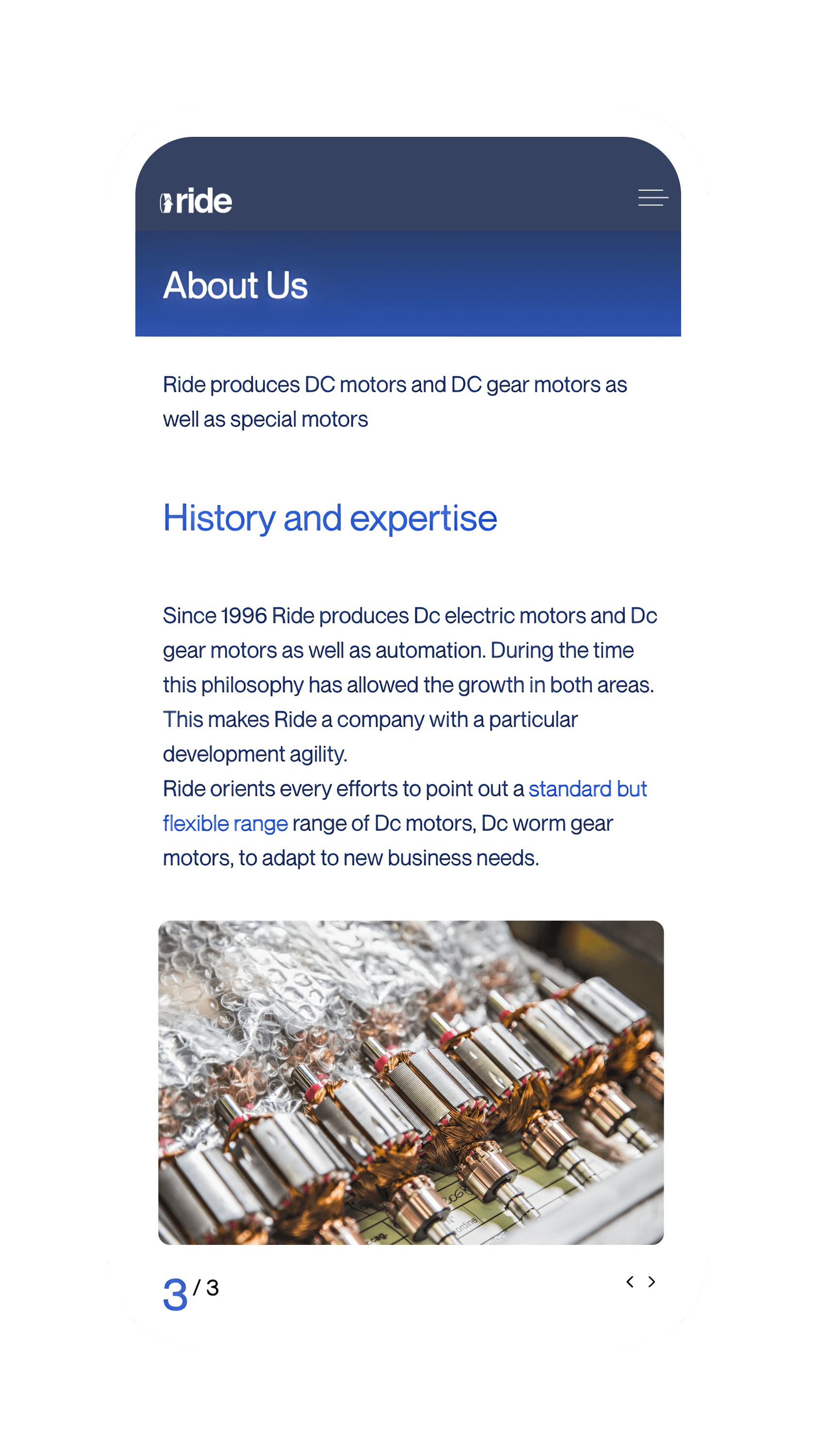 Ride è un primario produttore di motori elettrici CC e motoriduttori, da anni rinnova la sua presenza digitale facendone uno strumento di lavoro utile per i propri clienti. Da questo ha preso il via la riprogettazione del sito internet con simulazione digitale dei prodotti.