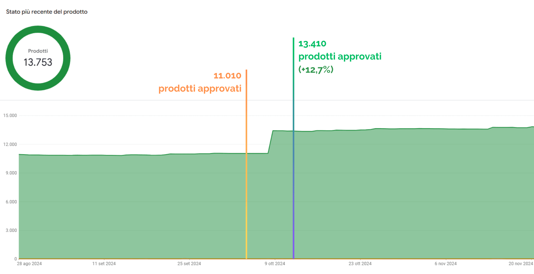 Aumento dei prodotti approvati nel Merchant dopo l’ampliamento del catalogo nel feed.