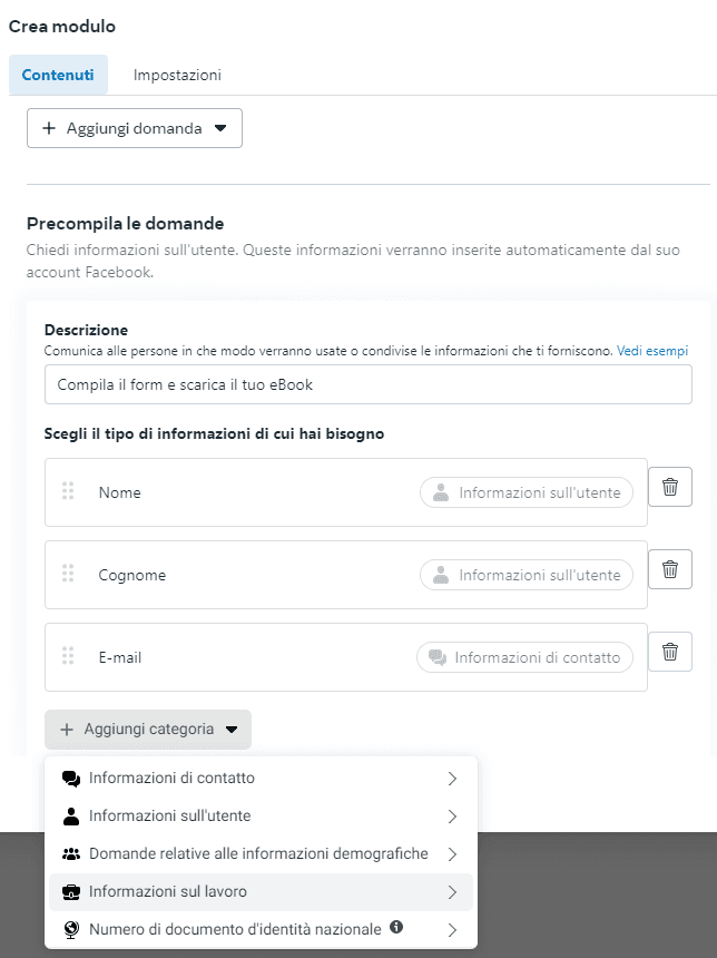 Una volta definito il tuo pubblico dovrai predisporre uno o più lead magnet mirati e di valore, che ti permetteranno di raccogliere contatti in target e di qualità, riducendo il più possibile quelli “sporchi”. Sì, perché purtroppo l’unico vero tasto dolente delle Facebook Lead Ads, se comparate a una campagna di lead generation tradizionale, è il rischio che il tuo contenuto venga scaricato da persone non sempre davvero interessate a ciò che stai offrendo. Lavorare bene a priori risulta quindi fondamentale per non sprecare budget, risorse e per costruire un database di utenti in target che potrebbero diventare clienti effettivi.
